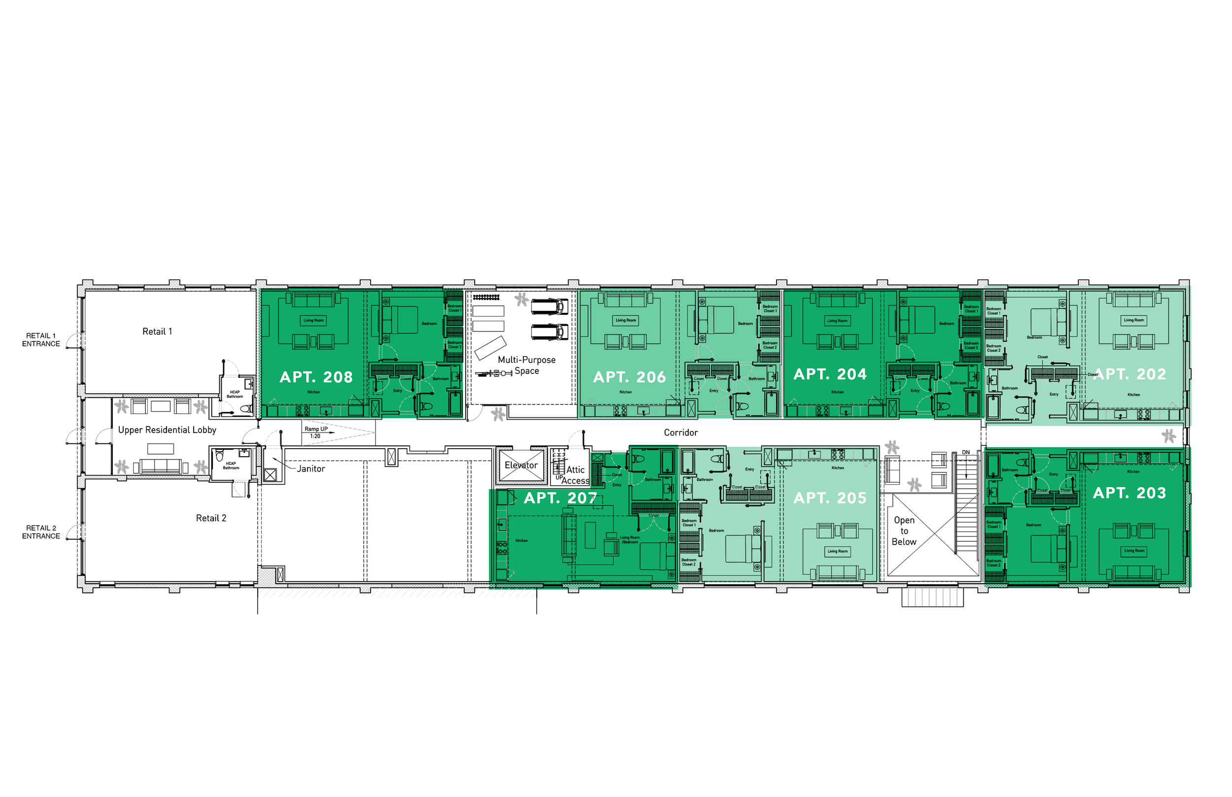 Residences are located on 2 levels. Each floor shares a residential lobby and outdoor garden space.